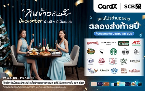 ลูกค้าบัตรเครดิต CardX และ SCB สามารถลงทะเบียนรับสิทธิ์แคมเปญ “กินข้าวกันมั๊ย December ร้านดี ๆ มีเต็มเวอร์” ผ่านแอปพลิเคชัน CardX ก่อนใช้จ่าย เพื่อรับความคุ้มค่าตลอดช่วงเวลาแห่งความสุข ตั้งแต่วันนี้ถึงวันที่ 31 มกราคม 2569 รายละเอียดเพิ่มเติมและตรวจสอบเงื่อนไขได้ที่ www.cardx.co.th