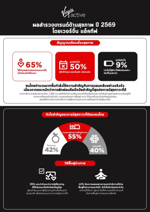 กรุงเทพฯ ประเทศไทย, 23 ธันวาคม 2568 – เวอร์จิ้น แอ็คทีฟ ประเทศไทย คลับดูแลสุขภาพแบบองค์รวม เผยในผลการสำรวจล่าสุดว่า “คุณภาพการนอนหลับ การฟื้นฟูร่างกาย และโภชนาการ” คือสามปัจจัยหลักที่คนไทยให้ความสำคัญสูงสุดในปัจจุบัน ท่ามกลางวิถีชีวิตคนเมืองที่เร่งรีบและวุ่นวาย ผลสำรวจยังชี้ให้เห็นถึงความต้องการคำแนะนำจากผู้เชี่ยวชาญที่เพิ่มมากขึ้น และเทรนด์การออกกำลังกายแบบผสมผสานกายใจ (mind-body exercises) เข้ามาเป็นส่วนหนึ่งของกิจวัตรประจำวันเพื่อยกระดับคุณภาพชีวิตให้ดียิ่งขึ้น