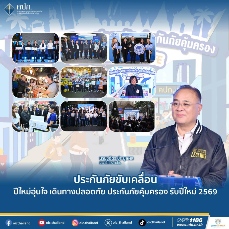 ในโอกาสเทศกาลปีใหม่ 2569 ที่กำลังจะมาถึงนี้ สำนักงาน คปภ. ขอส่งความปรารถนาดีไปยังประชาชนทุกคน ไม่ว่าจะเดินทางกลับภูมิลำเนา ท่องเที่ยว หรือใช้เวลาอยู่ร่วมกับครอบครัวและคนที่รัก ขอให้ทุกการเดินทางเป็นไปด้วยความปลอดภัย อุ่นใจ และมั่นใจ โดยมีการประกันภัยเป็นเครื่องมือสำคัญที่ช่วยบริหารความเสี่ยงในทุกเทศกาลสำคัญ เพื่อให้ช่วงเวลาดังกล่าวเป็นเทศกาลแห่งรอยยิ้ม ความอบอุ่น และความทรงจำที่ดีอย่างแท้จริง เลขาธิการ คปภ. กล่าวในตอนท้าย