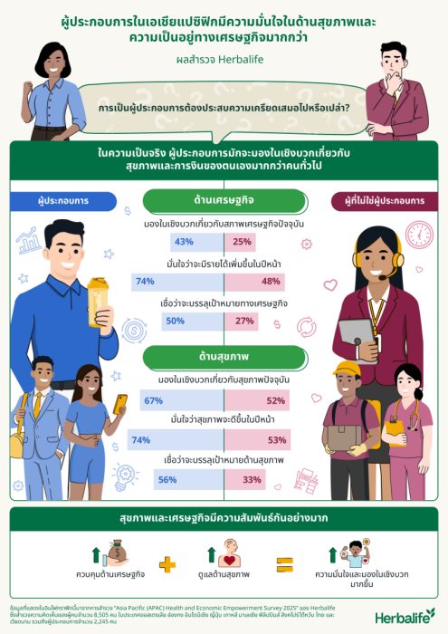 กรุงเทพฯ – เฮอร์บาไลฟ์ ผู้นำด้านโภชนาการ ความเป็นอยู่ที่ดี และคอมมูนิตี้ระดับโลก เผยผลการสำรวจ “APAC Health and Economic Empowerment Survey 2025” พบแนวโน้มความเชื่อมั่นทางเศรษฐกิจที่แข็งแกร่งในกลุ่มผู้ประกอบการ โดยกว่า 3 ใน 4 หรือคิดเป็น 74% คาดว่าสถานการณ์เศรษฐกิจส่วนตัวของตนเองจะดีขึ้นภายใน 12 เดือนข้างหน้า ในขณะที่กลุ่มที่ไม่ใช่ผู้ประกอบการกว่า 48% ก็มีมุมมองเช่นเดียวกัน