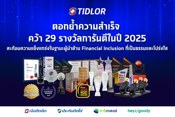 บริษัท เงินติดล้อ จำกัด (มหาชน) บริษัทในกลุ่ม Tidlor Holdings (TIDLOR) ผนึกกำลังธุรกิจสินเชื่อและนายหน้าประกัน ภายใต้แบรนด์ เงินติดล้อ ประกันติดโล่ อารีเกเตอร์ และเฮ้ กู๊ดดี้ประกาศความสำเร็จครั้งสำคัญของปี 2025 ด้วยการคว้ารางวัลจากหลากหลายเวทีระดับประเทศและเอเชียรวมถึง 29 รางวัล ตอกย้ำความแข็งแกร่งของกลุ่มธุรกิจ ในฐานะผู้นำด้านสินเชื่อและนายหน้าประกัน ที่มุ่งสร้างโอกาสทางการเงินอย่างเป็นธรรม พร้อมยกระดับคุณภาพชีวิตของลูกค้าและสังคมไทยอย่างต่อเนื่อง