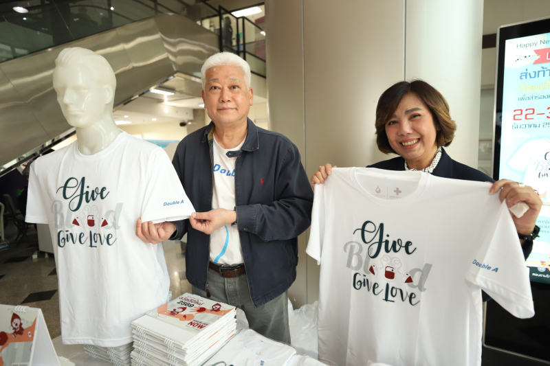 ทั้งนี้ ดั๊บเบิ้ล เอ ได้ร่วมสนับสนุนเสื้อลายพิเศษ “Give Blood Give Love” เพื่อมอบเป็นของที่ระลึกแทนคำขอบคุณให้แก่ผู้มาบริจาคโลหิต โดยมี นายชาญวิทย์ จารุสมบัติ กรรมการบริษัท และรองกรรมการผู้จัดการใหญ่ ด้านสื่อสารและภาพลักษณ์องค์กร ดั๊บเบิ้ล เอ เป็นตัวแทนมอบเสื้อรวม 500 ตัว และได้รับเกียรติจาก นางสาวปิยนันท์ คุ้มครอง ผู้ช่วยผู้อำนวยการด้านจัดหาโลหิตและภาพลักษณ์องค์กร ศูนย์บริการโลหิตแห่งชาติ สภากาชาดไทย เป็นผู้แทนรับมอบ ณ ศูนย์บริการโลหิตแห่งชาติ สภากาชาดไทย