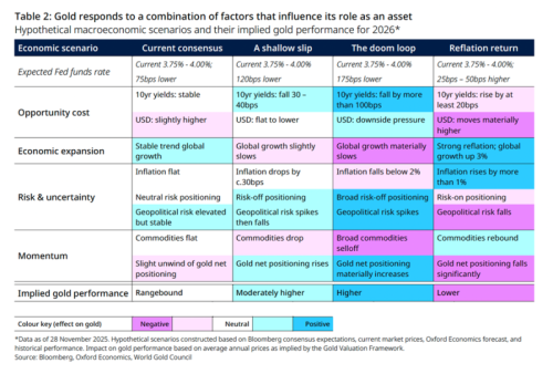 [2] ผลกระทบเชิงสมมติฐานต่อทองคำภายใต้สถานการณ์เศรษฐกิจมหภาคต่าง ๆ ที่นำเสนอนี้ ได้ประมวลผลจากกรอบการประเมินมูลค่าทองคำของ WGC (Gold Valuation Framework) โดยอ้างอิงจากปัจจัยที่เกี่ยวข้องหลากหลายด้าน สามารถศึกษารายละเอียดเพิ่มเติมได้จากบทความ Gold Outlook 2026: Push ahead or pull back | World Gold Council