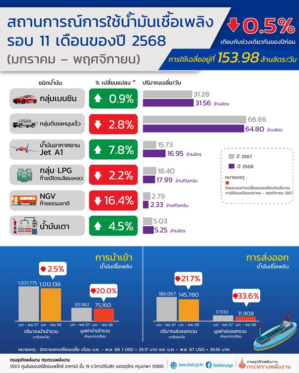 นายสราวุธ แก้วตาทิพย์ อธิบดีกรมธุรกิจพลังงาน เผยภาพรวมการใช้น้ำมันเชื้อเพลิง ในช่วงเดือนมกราคม – พฤศจิกายน 2568 มีปริมาณอยู่ที่ 153.98 ล้านลิตร/วัน ลดลงร้อยละ 0.5 เมื่อเทียบกับช่วงเดียวกันของปีก่อน โดยก๊าซธรรมชาติสำหรับยานยนต์ (NGV) มีปริมาณการใช้ลดลงสูงสุด ที่ร้อยละ 16.4 ตามด้วยก๊าซปิโตรเลียมเหลว (LPG) ลดลงร้อยละ 2.2 และน้ำมันดีเซลหมุนเร็ว ลดลงร้อยละ 2.8 ขณะที่น้ำมันอากาศยานเชิงพาณิชย์ (Jet A1) มีปริมาณการใช้เพิ่มขึ้นร้อยละ 7.8 การใช้น้ำมันเตาเพิ่มขึ้นร้อยละ 4.5 และกลุ่มเบนซินเพิ่มขึ้นร้อยละ 0.9 โดยมีรายละเอียดปริมาณการใช้น้ำมันเชื้อเพลิงแต่ละชนิดเมื่อเทียบกับช่วงเวลาเดียวกันของปีก่อน ดังนี้