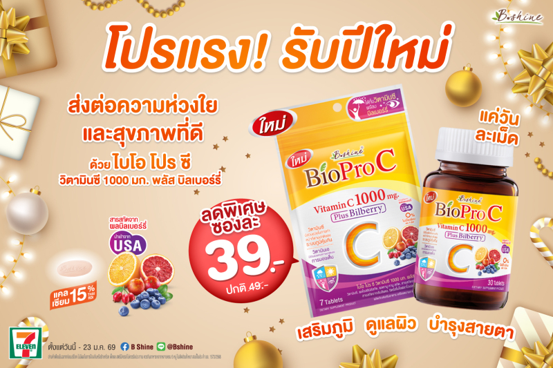 เพื่อเป็นของขวัญสุขภาพดีรับปีใหม่ บีไชน์จัดโปรโมชั่น “ไบโอ โปร ซี” แบบซอง (บรรจุ 7 เม็ด) ลดราคาพิเศษเหลือเพียง 39 บาท (จากราคาปกติ 49 บาท) และสิทธิพิเศษสำหรับสมาชิก All Member ลดเพิ่มเหลือเพียง 38 บาท สามารถหาซื้อได้แล้ว ตั้งแต่วันนี้ – 23 มกราคม 2569 ที่ร้านเซเว่น อีเลฟเว่น ทุกสาขาทั่วประเทศ