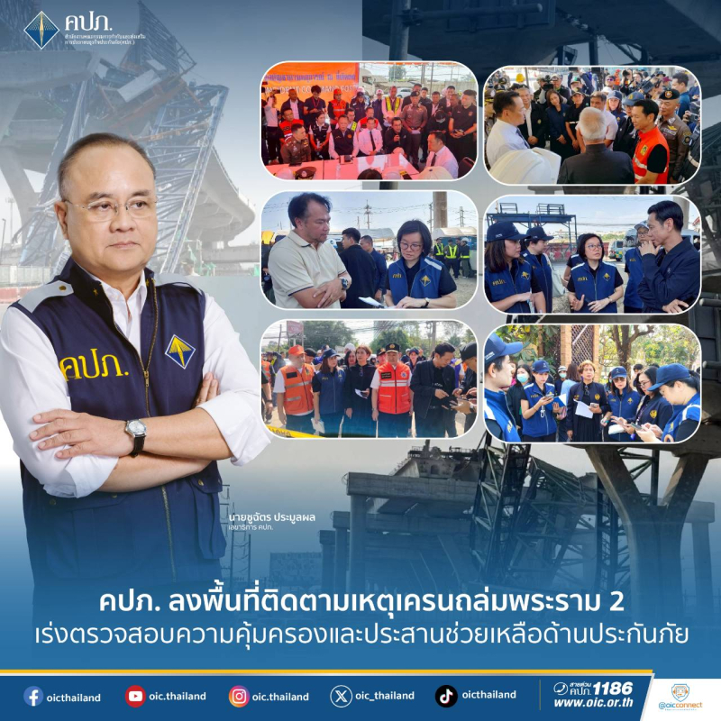 ในการนี้ นายกรัฐมนตรีได้มีข้อสั่งการให้ทุกหน่วยงานบูรณาการการทำงานร่วมกัน เพื่อเร่งคลี่คลายสถานการณ์และเปิดการจราจรให้ประชาชนสามารถสัญจรได้ตามปกติโดยเร็ว โดยเน้นย้ำให้ความสำคัญกับความปลอดภัยของประชาชนและเจ้าหน้าที่เป็นอันดับแรก พร้อมกำชับมาตรการความปลอดภัยในพื้นที่ก่อสร้างอย่างเข้มงวดเพื่อป้องกันไม่ให้เกิดเหตุซ้ำ และให้เร่งรัดการเยียวยาช่วยเหลือผู้ได้รับผลกระทบอย่างทั่วถึงในทุกมิติ รวมถึงการดูแลสิทธิประโยชน์ด้านการประกันภัยให้เป็นไปอย่างรวดเร็ว โปร่งใส และเป็นธรรม ทั้งนี้ สำนักงาน คปภ. พร้อมสนองข้อสั่งการดังกล่าว โดยจะบูรณาการร่วมกับหน่วยงานที่เกี่ยวข้องและบริษัทประกันภัย เพื่อเร่งรัด การตรวจสอบความคุ้มครองและการจ่ายค่าสินไหมทดแทนแก่ผู้ได้รับผลกระทบอย่างเต็มที่