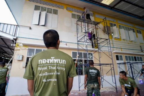 นอกจากการฟื้นฟูโรงพยาบาล TOA ยังได้ร่วมกับทหารจิตอาสา มณฑลทหารบกที่ 42 (ค่ายเสนาณรงค์) กองพลพัฒนาที่ 4 ค่ายรัตนพล นักศึกษาจากมหาวิทยาลัยสงขลานครินทร์ และมหาวิทยาลัยหาดใหญ่ ลงพื้นที่ โรงเรียนบ้านคลองหวะ (ทวีรัตนราษฎร์บำรุง) ร่วมกันทำความสะอาดและทาสีอาคารเรียนใหม่ เพื่อลบเลือนรอยคราบน้ำและฟื้นฟูบรรยากาศการเรียนรู้ที่สดใส