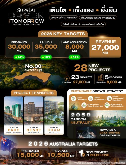 .บมจ.ศุภาลัย ประกาศทิศทางธุรกิจปี 2569 ภายใต้แนวคิด Driven for Tomorrow ท่ามกลางเศรษฐกิจที่ยังขยายตัวในกรอบจำกัด พร้อมเดินหน้าธุรกิจอย่างมั่นคง ควบคู่การเติบโตอย่างยั่งยืน ผ่านการพัฒนาโครงการในทำเลและรูปแบบที่สอดคล้องกับกำลังซื้อของตลาด ตั้งเป้ายอดขายรวมทั้งในประเทศไทยและออสเตรเลียปี 2569 มูลค่า 45,000 ล้านบาท* พร้อมแผนเปิดโครงการใหม่ 28 โครงการ มูลค่า 35,000 ล้านบาท พร้อมลุยสุพรรณบุรีและเกาะสมุย เดินหน้าสร้างฐานรายได้ให้สมดุลมากขึ้นผ่านธุรกิจต่างประเทศ โดยเฉพาะตลาดอสังหาฯ ออสเตรเลียที่ปี 2568 เติบโตกว่า 370% พร้อมรุกธุรกิจคลังสินค้าให้เช่า ควบคู่ยกระดับองค์กรด้วย Data Driven และกรอบ Sustainability Driven มุ่งสู่ Carbon Neutrality ปี 2050