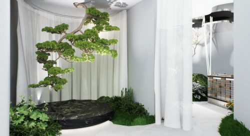 ภายในนิทรรศการผู้ชมจะได้สัมผัส The Living Exhibition ผ่าน 5 โซนสวนที่ผสาน ศิลปะ แฟชั่น เทคโนโลยี และธรรมชาติ เข้าด้วยกันอย่างกลมกลืน เพื่อถ่ายทอดมุมมองใหม่ของการอยู่อาศัยในโลกอนาคต ประกอบด้วย ห้องที่ 1 “Garden of Stillness” ช่วงเวลาที่ความนิ่งไม่ใช่ความว่าง แต่กลายเป็นความสมดุลเงียบสงบ เชื่อมผู้คนเข้ากลับสภาพในใจอย่างละมุนและลึกซึ้ง, ห้องที่ 2 “Garden of Connection” การสัมผัสพื้นผิวธรรมชาติเพื่อสร้างประโยชน์เชิงจิตใจและความสงบภายในตัวเอง รู้สึกถึงแรงสั่นสะเทือนและเสียงของโลก ผ่านการสัมผัสที่เต็มไปด้วยอารมณ์และความเชื่อมโยง, ห้องที่ 3 “Garden of Motion” พื้นที่ที่ชวนให้ผู้ชมได้หยุดมองความงามและความเปลี่ยนแปลงที่ค่อยๆ เกิดขึ้นตรงหน้า และปล่อยให้แสง-เงา-จังหวะของธรรมชาติไหลผ่านตัวไปอย่างแผ่วเบา การเปลี่ยนโหมดอัตโนมัติ การเปลี่ยนจาก “กลางวัน” เป็น “กลางคืน”