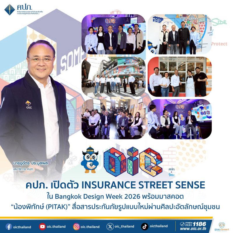 “สำนักงาน คปภ. ขอเชิญชวนประชาชน นักท่องเที่ยว และผู้สนใจงานศิลปะร่วมสมัย ร่วมสัมผัสประสบการณ์สื่อศิลป์ในพื้นที่สาธารณะ ผ่านโครงการ INSURANCE STREET SENSE ซึ่งเปิดให้เข้าชมอย่างเป็นทางการตั้งแต่วันนี้เป็นต้นไป ณ HUGS Songwat ถนนทรงวาด กรุงเทพมหานคร พร้อมเรียนรู้เรื่องการประกันภัยไปพร้อมกับการท่องเที่ยวเชิงสร้างสรรค์ เพื่อร่วมกันส่งเสริมความปลอดภัย ยกระดับคุณภาพชีวิต และเสริมสร้างความมั่นคงให้กับชุมชนและภาคธุรกิจ ทั้งนี้ ในปี 2569 ถือเป็นปีที่สำนักงาน คปภ. จะเริ่มปรับรูปแบบและแนวทางการใช้สื่อในการสื่อสารความรู้ด้านการประกันภัย ให้สอดรับกับพฤติกรรมและไลฟ์สไตล์ของกลุ่มเป้าหมายมากยิ่งขึ้น โดยมุ่งเน้นการใช้ สื่อสร้างสรรค์และประสบการณ์จริงในพื้นที่สาธารณะ เพื่อให้การประกันภัยเป็นเรื่องใกล้ตัว เข้าใจง่าย และเข้าถึงประชาชนได้อย่างทั่วถึง อันจะนำไปสู่การขับเคลื่อนชุมชนเมืองให้ปลอดภัย เข้มแข็ง และเติบโตอย่างยั่งยืนในระยะยาว” เลขาธิการ คปภ. กล่าวในตอนท้าย