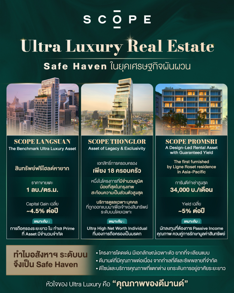 บริษัท สโคป จำกัด ในฐานะผู้พัฒนาอสังหาริมทรัพย์คุณภาพระดับ Ultra Luxury ชี้ให้เห็นว่า ในสภาวะเช่นนี้ การลงทุนที่มีคุณค่าไม่ใช่การมองหา “ราคาที่ถูกกว่า” แต่คือการเลือก สินทรัพย์ที่มีดีมานด์คุณภาพ มีตัวตน และสามารถยืนหยัด สร้างผลตอบแทนได้ในทุกวัฏจักรเศรษฐกิจ ด้วยเหตุนี้ อสังหาริมทรัพย์ระดับบน (Ultra Luxury Real Estate) จึงไม่ได้ถูกมองเพียงในฐานะที่อยู่อาศัย แต่เป็น สินทรัพย์หลบภัย (Safe Haven) ที่ตอบโจทย์ทั้งความมั่นคงในการถือครอง ศักยภาพการเติบโตของมูลค่าในระยะยาว และการสร้างกระแสรายได้ที่สามารถคาดการณ์ได้ ท่ามกลางความไม่แน่นอนของสินทรัพย์ทางการเงินประเภทอื่น