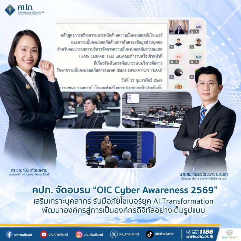 เมื่อวันที่ 13 กุมภาพันธ์ 2569 สำนักงานคณะกรรมการกำกับและส่งเสริมการประกอบธุรกิจประกันภัย (สำนักงาน คปภ.) จัดอบรมหลักสูตร “การสร้างความตระหนักด้านความมั่นคงปลอดภัยไซเบอร์และข้อมูลส่วนบุคคล (Cybersecurity and Personal Data Protection Awareness)” ในรูปแบบ Hybrid ทั้งผ่านระบบออนไลน์ และแบบ On-site ณ ห้องประชุมชั้น 2 อาคารสถาบันวิทยาการประกันภัยระดับสูง สำนักงาน คปภ. ถนนรัชดาภิเษก เพื่อวางรากฐานความเชื่อมั่นดิจิทัล (Digital Trust) และเตรียมความพร้อมของบุคลากรในการรับมือกับภัยคุกคามทางไซเบอร์ในยุค AI Transformation โดยได้รับเกียรติจากนางสาวชญานิน เกิดผลงาม รองเลขาธิการ ด้านกลยุทธ์และเทคโนโลยี เป็นประธานกล่าวเปิดงานผ่านระบบออนไลน์ พร้อมได้มอบนโยบายและ เตรียมความพร้อมให้แก่คณะทำงาน ISMS และเจ้าหน้าที่ที่เกี่ยวข้องในการรับมือกับภัยคุกคามทางไซเบอร์รูปแบบใหม่ พร้อมด้วยนายสมเกียรติ วัฒนาประสบสุข ผู้ช่วยเลขาธิการ สายเทคโนโลยีสารสนเทศ คณะทำงานบริหารจัดการความมั่นคงปลอดภัยสารสนเทศ (ISMS Working Group) และเจ้าหน้าที่ผู้ปฏิบัติงานที่เกี่ยวข้องของสำนักงาน คปภ. เข้าร่วม