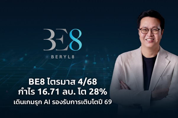 นายอภิเษก เทวินทรภักติ ประธานเจ้าหน้าที่บริหาร บริษัท เบริล 8 พลัส จำกัด (มหาชน) หรือ BE8 ผู้นำธุรกิจให้บริการที่ปรึกษาด้าน AI-Powered Digital Transformation แบบครบวงจร เปิดเผยผลการดำเนินงานไตรมาส 4/2568 บริษัทและบริษัทย่อยมีรายได้รวม 620.71 ล้านบาท เพิ่มขึ้น 2.97% เมื่อเทียบกับไตรมาสก่อน สืบเนื่องมาจากการเพิ่มขึ้นของงานด้านเทคโนโลยี ในกลุ่มลูกค้าธุรกิจประกันภัยและประกันชีวิต ทำให้มีกำไรสุทธิ 16.71 ล้านบาท เพิ่มขึ้น 28.54% เมื่อเทียบกับไตรมาสก่อน