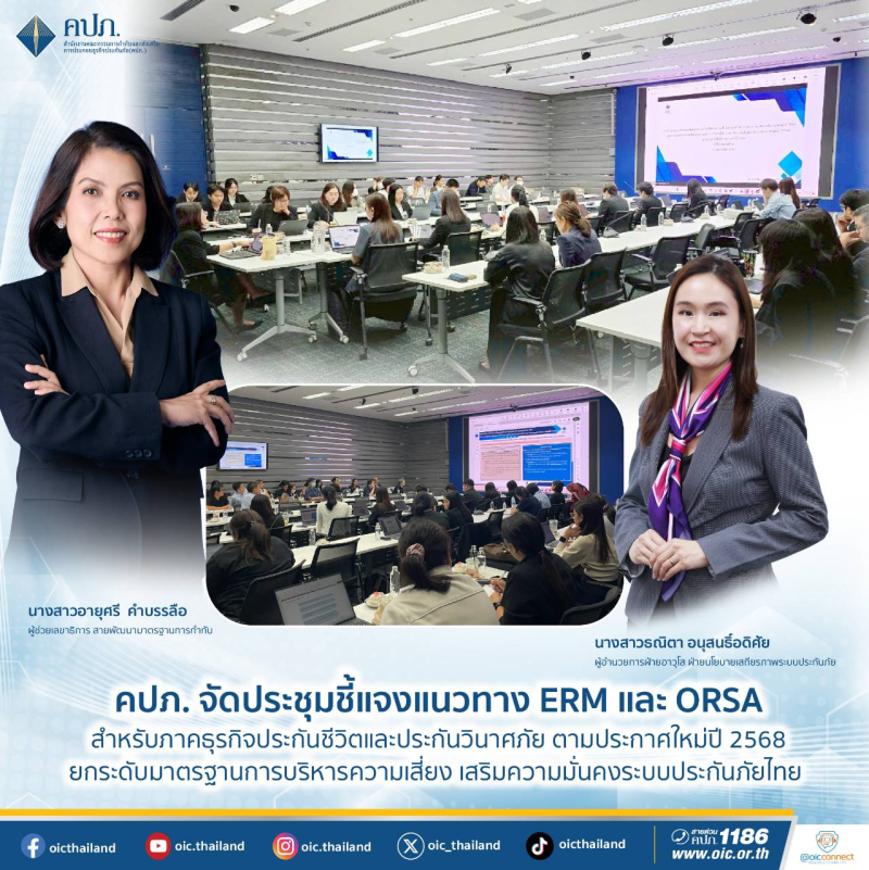ประกาศฯ ฉบับปี 2568 สำนักงาน คปภ. กำหนดให้บริษัทประกันภัยทุกแห่งต้องส่งรายงาน ERM/ORSA ให้กับสำนักงานเป็นประจำทุกปี โดยต้องมีการประเมินความเพียงพอของเงินกองทุนที่สอดคล้องกับแผนธุรกิจและการบริหารความเสี่ยงของ บริษัทประกันภัยอย่างสม่ำเสมอ รวมถึงต้องจัดทำรายงานสถานะความเสี่ยงให้กับสำนักงานเป็นประจำทุก 6 เดือน การประชุมครั้งนี้จัดขึ้น เพื่อให้บริษัทประกันภัยเข้าใจถึงการบริหารความเสี่ยงได้อย่างเป็นระบบ ครอบคลุมทุกมิติของความเสี่ยงที่อาจเกิดขึ้นจากการดำเนินธุรกิจ และสามารถประเมินความเพียงพอของเงินกองทุนได้อย่างเหมาะสมในสถานการณ์ปกติและสถานการณ์วิกฤต อันจะช่วยเสริมสร้างความมั่นคงทางการเงิน และยกระดับมาตรฐานการกำกับดูแลธุรกิจประกันภัยไทยให้สอดคล้องกับแนวปฏิบัติสากล ทั้งนี้ ที่ประชุมได้เน้นย้ำถึงความสำคัญของการนำกรอบการบริหารความเสี่ยงแบบองค์รวม (ERM) มาใช้เป็นเครื่องมือหลักในการกำกับดูแลและบริหารจัดการความเสี่ยงขององค์กร โดยครอบคลุมตั้งแต่การกำหนดนโยบายการบริหารความเสี่ยง การกำหนดระดับความเสี่ยงที่ยอมรับได้ (Risk Appetite) การพัฒนาวัฒนธรรมองค์กรด้านการบริหารความเสี่ยง (Risk Culture) ตลอดจนการติดตามและประเมินความเพียงพอของเงินกองทุนอย่างต่อเนื่อง ผ่านกระบวนการ ORSA ซึ่งจะช่วยให้ บริษัทประกันภัยสามารถวิเคราะห์ผลกระทบจากปัจจัยความเสี่ยงในอนาคต วางแผนบริหารเงินกองทุนได้อย่างเหมาะสม และเสริมสร้างความมั่นคงทางการเงินให้สอดคล้องกับระดับความเสี่ยงและแผนการดำเนินธุรกิจในระยะยาว