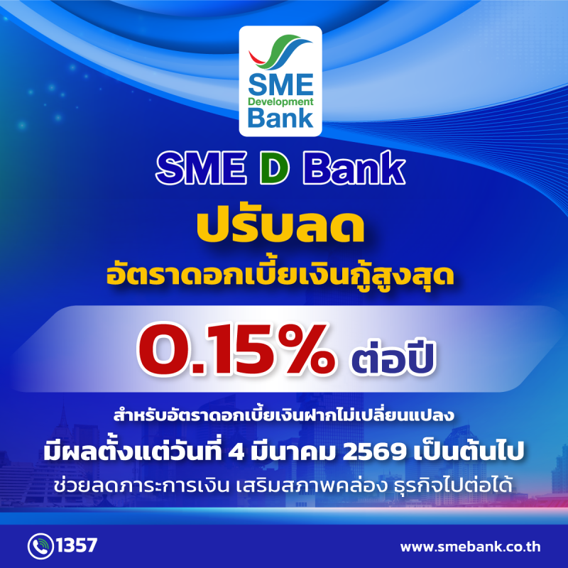 นายพิชิต มิทราวงศ์ กรรมการผู้จัดการ ธนาคารพัฒนาวิสาหกิจขนาดกลางและขนาดย่อมแห่งประเทศไทย (ธพว.) หรือ SME D Bank เปิดเผยว่า จากที่ประชุมคณะกรรมการนโยบายการเงิน (กนง.) เมื่อวันที่ 25 กุมภาพันธ์ 2569 มีมติลดอัตราดอกเบี้ยนโยบาย 0.25% ต่อปี จาก 1.25% เป็น 1.00% ต่อปี ดังนั้น SME D Bank ธนาคารเพื่อเอสเอ็มอีไทย ขานรับนโยบายธนาคารแห่งประเทศไทย (ธปท.) ประกาศปรับลดอัตราดอกเบี้ยเงินกู้สูงสุด 0.15% เพื่อบรรเทาภาระต้นทุนทางการเงินให้แก่ผู้ประกอบการเอสเอ็มอี และสนับสนุนการฟื้นตัวของเศรษฐกิจ โดยอัตราดอกเบี้ยเงินกู้ขั้นต่ำ (Minimum Loan Rate : MLR) อยู่ที่ 7.050% ต่อปี อัตราดอกเบี้ยลูกค้ารายย่อยชั้นดี (Minimum Retail Rate : MRR) อยู่ที่ 7.025% ต่อปี และ ประเภทเงินเบิกเกินบัญชี (Minimum Overdraft Rate : MOR) อยู่ที่ 7.150% ต่อปี มีผลตั้งแต่วันที่ 4 มีนาคม 2569 เป็นต้นไป