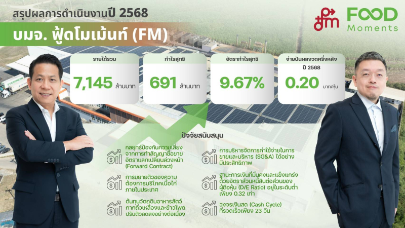 ‘บมจ.ฟู้ดโมเม้นท์’ หรือ FM ประกาศผลการดำเนินงานปี 2568 ทำรายได้ 7,145 ล้านบาท และมีกำไรจากการดำเนินงานพุ่งขึ้นเป็น 816 ล้านบาท ส่วนกำไรสุทธิอยู่ที่ 691 ล้านบาท ชะลอตัวเล็กน้อย (YoY) เนื่องจากมีค่าใช้จ่ายภาษีเพิ่มขึ้นซึ่งเป็นผลกระทบชั่วคราว เหตุจากความล่าช้าในกระบวนการอนุมัติบัตร BOI โดยสามารถทำอัตรากำไรสุทธิสูงถึง 9.67% แม้เผชิญแรงกดดันความท้าทายจากสถานการณ์ภายนอกรอบด้าน โดยเฉพาะค่าเงินบาทที่แข็งค่า แต่ได้รับปัจจัยบวกจากความต้องการเนื้อไก่ในประเทศที่ขยายตัว และการบริหารจัดการต้นทุนวัตถุดิบอาหารสัตว์ที่มีประสิทธิภาพ เตรียมจ่ายเงินปันผลอีก 0.20 บาทต่อหุ้น ขึ้น XD วันที่ 8 พ.ค. นี้ ส่วนปี 2569 รับอานิสงส์จากสิทธิประโยชน์ BOI ใหม่เต็มที่ หนุนความสามารถทำกำไรระยะยาว