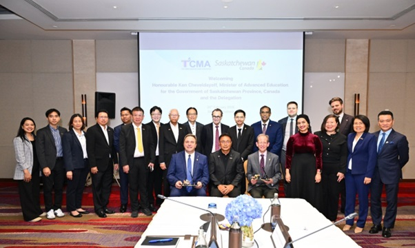 ดร.ชนะ ภูมี นายกกิตติมศักดิ์ TCMA ให้การต้อนรับ ฯพณฯ เคน เช้เวลเดย์ออฟ รัฐมนตรีว่าการกระทรวงการอุดมศึกษา รัฐซัสแคตเชวัน แคนาดา และศาสตราจารย์เจฟฟ์ เคเชน อธิการบดีและรองนายก-