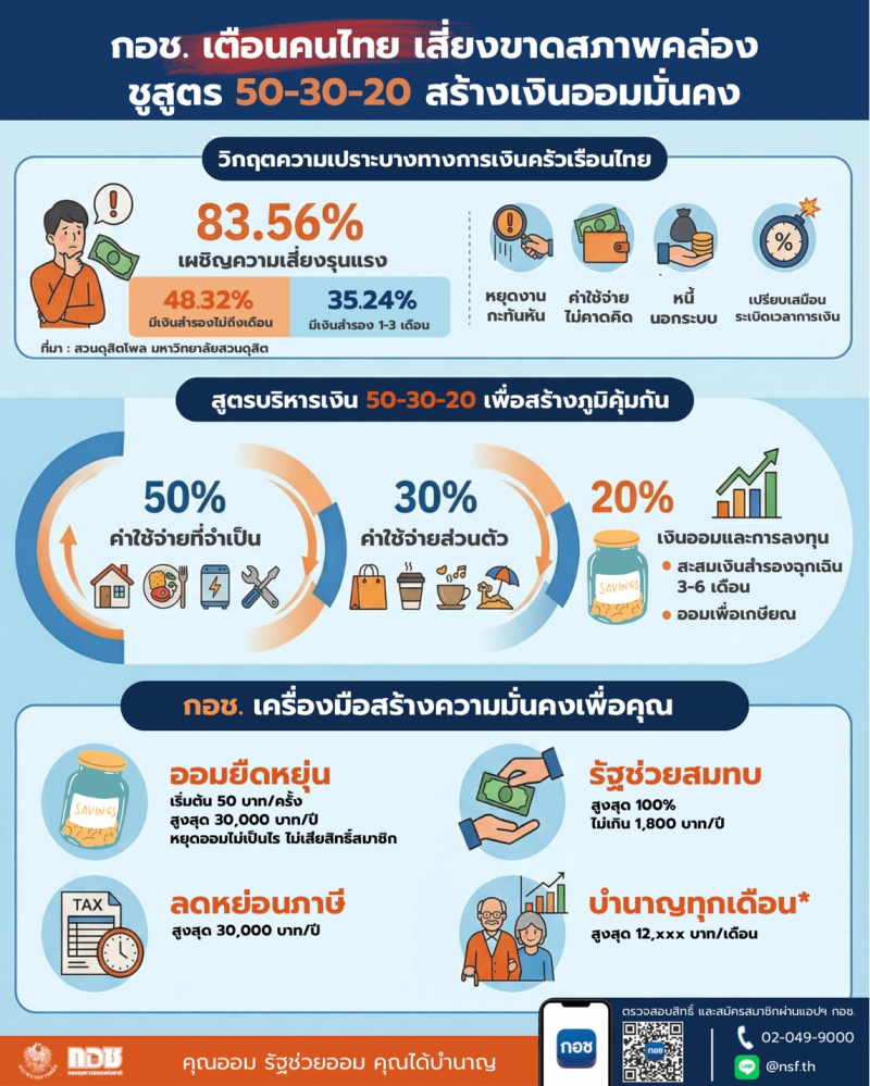 กองทุนการออมแห่งชาติ (กอช.) เผยข้อมูลสะท้อนวิกฤตการเงินครัวเรือนไทย หลังผลสำรวจพบคนไทยเกือบครึ่งมีเงินสำรองไม่ถึง 1 เดือน เสี่ยงลำบากหากเกิดเหตุไม่คาดฝัน แนะใช้สูตร “50-30-20” จัดสรรรายได้สร้างเกราะคุ้มกันทางการเงิน พร้อมชู กอช. เป็นเครื่องมือสร้างเงินบำนาญสำหรับแรงงานนอกระบบ เริ่มต้นเพียง 50 บาท รัฐช่วยสมทบเพิ่ม 100%