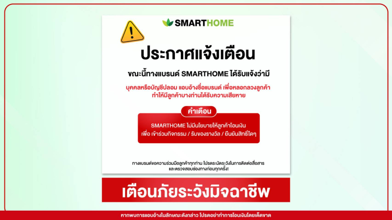 จากการตรวจสอบ บริษัทฯ พบว่ามิจฉาชีพมีการใช้ชื่อ โลโก้ ภาพลักษณ์ของ SMARTHOME รวมถึง แอบอ้างใช้เลขที่บัญชีของบริษัทฯ เพื่อสร้างความน่าเชื่อถือ โดยหลอกลวงให้ผู้บริโภคโอนเงินเพื่อเข้าร่วมกิจกรรม รับของรางวัล หรือยืนยันสิทธิ์ต่าง ๆ ซึ่งเป็นการกระทำที่ไม่เป็นความจริง และสร้างความเข้าใจผิดอย่างร้ายแรง