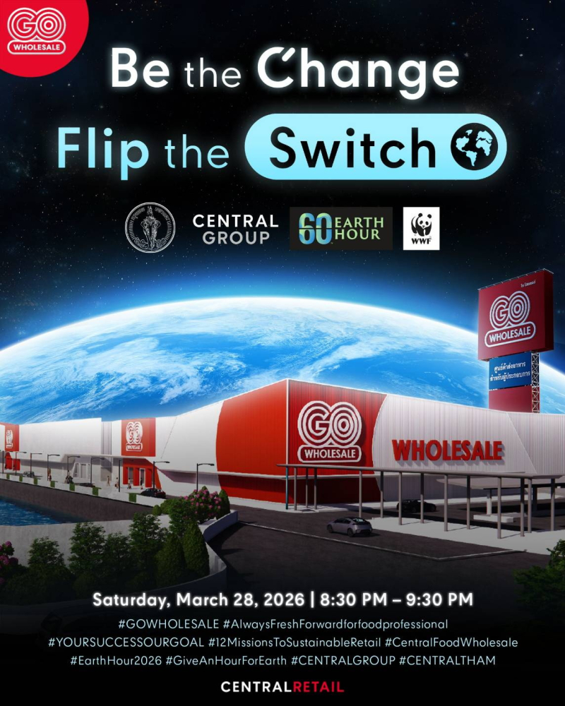 โก โฮลเซลล์ (GO WHOLESALE) ศูนย์ค้าส่งวัตถุดิบอาหารที่มีความสดใหม่ตลอดเวลา เพื่อผู้ประกอบการ ภายใต้การดำเนินงานของบริษัท เซ็นทรัล ฟู้ด โฮลเซลล์ จำกัด ในเครือเซ็นทรัล รีเทล ขานรับนโยบายด้านสิ่งแวดล้อมและความยั่งยืน ของกลุ่มเซ็นทรัล ด้วยการสนับสนุนกิจกรรม “60 Earth Hour” หรือการปิดไฟ 1 ชั่วโมง เพื่อลดภาวะโลกร้อน (Earth Hour 2026) อีกทั้งยังสอดรับกับวิกฤติพลังงานที่เกิดขึ้น