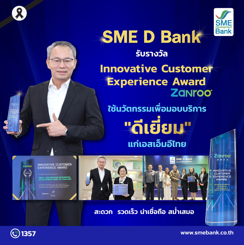 ธนาคารพัฒนาวิสาหกิจขนาดกลางและขนาดย่อมแห่งประเทศไทย (ธพว.) หรือ SME D Bank รับมอบรางวัล “Innovative Customer Experience Award” จาก “Zanroo” บริษัทชั้นนำผู้ให้บริการเทคโนโลยี Social Listening และ Data Analytics โดยจะมอบรางวัลดังกล่าวให้แก่องค์กรหรือแบรนด์ที่นำเทคโนโลยีดิจิทัลมาบริการดูแลลูกค้าได้อย่างดีเยี่ยม ทั้งความรวดเร็ว น่าเชื่อถือ สม่ำเสมอ ลดขั้นตอน ตลอดจนสร้างประสบการณ์ที่ดี และความพึงพอใจจากบริการที่ราบรื่น ซึ่งบริการของ SME D Bank มีความโดดเด่น ยึด “ลูกค้าเป็นศูนย์กลาง” นำนวัตกรรมมายกระดับขับเคลื่อนการให้บริการลูกค้าและผู้ประกอบการเอสเอ็มอีได้อย่างดีเยี่ยม เหมาะสมกับยุคดิจิทัล ด้วยการใช้เทคโนโลยี เช่น Social Monitoring และ Chatbot มาอำนวยความสะดวก ตอบสนองความต้องการของลูกค้าในทุกช่องทางติดต่อ ช่วยให้ลูกค้า โดยเฉพาะกลุ่มผู้ประกอบการเอสเอ็มอีเข้าถึงบริการต่าง ๆ ทั้งด้านการเงิน หรือด้านการพัฒนา ได้สะดวกสบาย รวมถึง สามารถตอบข้อสงสัยและคำถามต่างๆ ได้ครบถ้วน ตลอด 24 ชม.