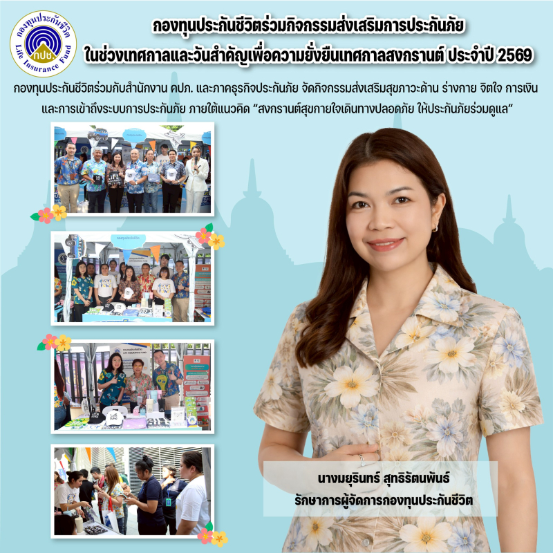 นางมยุรินทร์ สุทธิรัตนพันธ์ รักษาการผู้จัดการกองทุนประกันชีวิต พร้อมด้วยพนักงาน เข้าร่วม “โครงการส่งเสริมการประกันภัยในช่วงเทศกาลและวันสำคัญเพื่อความยั่งยืนเทศกาลสงกรานต์ ประจำปี 2569” จัดโดยสำนักงาน คปภ. และภาคอุตสาหกรรมประกันภัย เมื่อวันที่ 3 เมษายน 2569 ณ สำนักงาน คปภ. ถนนรัชดาภิเษก ซึ่งมีวัตถุประสงค์เพื่อส่งเสริมสุขภาวะด้านร่างกาย จิตใจ การเงิน และส่งเสริมการเข้าถึงระบบประกันภัยในช่วงเทศกาลสำคัญ โดยกองทุนฯ ร่วมออกบูธประชาสัมพันธ์ สร้างความรู้ ความเข้าใจเกี่ยวกับบทบาท ภารกิจของกองทุนประกันชีวิต แนะนำวิธีการตรวจสอบเงินกรมธรรม์ล่วงพ้นอายุความ เพื่อให้ประชาชนได้รับเงินคืนตามสิทธิด้วยความสะดวก อันเป็นการเสริมสร้างความเชื่อมั่นต่อธุรกิจประกันชีวิต