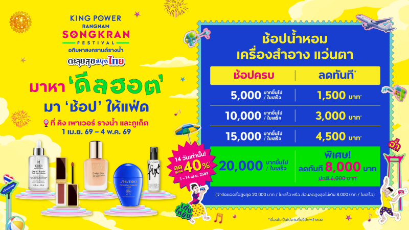 คิง เพาเวอร์ ฉลองเทศกาลสงกรานต์สุดยิ่งใหญ่ ในแคมเปญ “อภิมหาสงกรานต์ รางน้ำ THE JOY OF THAI ตะลุยสุข สนุกไทย” มาหาดีลฮอตกับส่วนลดแบบฉ่ำๆ สูงสุด 30% เมื่อช้อปสินค้าแผนกน้ำหอม เครื่องสำอางที่ร่วมรายการ เพียงช้อปทุก 5,000 บาท/ใบเสร็จ รับส่วนลดทันที 1,500 บาท ยิ่งช้อปเยอะ ยิ่งลดเพิ่ม!