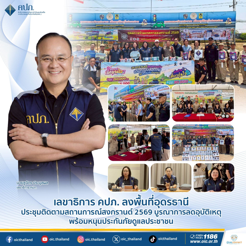 เมื่อวันที่ 14 เมษายน 2569 นายชูฉัตร ประมูลผล เลขาธิการคณะกรรมการกำกับและส่งเสริมการประกอบธุรกิจประกันภัย (เลขาธิการ คปภ.) พร้อมด้วย นางสาวชัชวริน โชติชูตระกูล ผู้ช่วยเลขาธิการ สายคุ้มครองสิทธิประโยชน์ และนายคณานุสรณ์ เที่ยงตระกูล ผู้ช่วยเลขาธิการ สายบริหาร ลงพื้นที่จังหวัดอุดรธานี เพื่อติดตามสถานการณ์การป้องกันและลดอุบัติเหตุทางถนนในช่วงเทศกาลสงกรานต์ 2569 และ การเตรียมความพร้อมในการให้ความช่วยเหลือประชาชนด้านการประกันภัยในพื้นที่ ทั้งนี้ จังหวัดอุดรธานีถือเป็นศูนย์กลางการคมนาคมและเศรษฐกิจที่สำคัญของภาคตะวันออกเฉียงเหนือตอนบน มีปริมาณการเดินทางของประชาชนทั้งในพื้นที่และข้ามจังหวัดเป็นจำนวนมาก ในช่วงเทศกาล รวมถึงเป็นพื้นที่เชื่อมโยงการเดินทางไปยังจังหวัดใกล้เคียงและพื้นที่ชายแดน ส่งผลให้มีความเสี่ยงต่อการเกิดอุบัติเหตุทางถนน ในระดับสูง สำนักงาน คปภ. จึงให้ความสำคัญในการลงพื้นที่เพื่อติดตามสถานการณ์อย่างใกล้ชิด พร้อมทั้งสนับสนุนการดำเนินงาน ของหน่วยงานในพื้นที่ เพื่อให้ประชาชนได้รับความคุ้มครองด้านการประกันภัยอย่างทั่วถึงและทันท่วงที