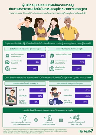 กรุงเทพฯ – เฮอร์บาไลฟ์ บริษัทและแพลตฟอร์มด้านสุขภาพและความเป็นอยู่ที่ดีชั้นนำระดับโลก เผยผลสำรวจใหม่จาก Asia Pacific (APAC) Health and Economic Empowerment Survey 2025 หรือแบบสำรวจด้านสุขภาพและการเสริมสร้างศักยภาพทางเศรษฐกิจในภูมิภาคเอเชียแปซิฟิก (APAC) ปี 2568 ซึ่งพบว่ามีผู้บริโภคเพียง 2 ใน 5 หรือ 43% เท่านั้นที่รู้สึกว่าตนเองมีศักยภาพสูงในการพัฒนาความเป็นอยู่ทางเศรษฐกิจ และมีเพียง 1 ใน 3 เท่านั้นที่มั่นใจว่าจะบรรลุเป้าหมายทางการเงินในอีก 12 เดือนข้างหน้า ด้วยเหตุนี้ หลายคนจึงวางแผนที่จะลดค่าใช้จ่ายที่ไม่จำเป็น รวมถึงลงทุน หรือเริ่มต้นธุรกิจเพื่อเพิ่มโอกาสในการบรรลุเป้าหมาย