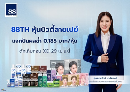ใครที่กำลังมองหาหุ้นพื้นฐานแน่น สตอรี่เริ่ด แถมปันผลปังๆ นาทีนี้ถ้าไม่พูดถึงหุ้นบิวตี้ตัวตึงอย่าง บมจ.88 (ไทยแลนด์) หรือ 88TH ถือว่าตกขบวน เพราะ 29 เม.ย.นี้ จ่อขึ้นเครื่องหมาย XD เตรียมแจกเงินสดเข้ากระเป๋าผู้ถือหุ้นเน้นๆ 0.185 บาท/หุ้น จ่ายจริงวันที่ 19 พ.ค. นี้แล้วจ้า… ใครยังไม่มีติดพอร์ตระวัง จะคุยกับเขาไม่รู้เรื่อง แต่ข่าวดียังไม่หมดแค่นั้น เพราะแว่วมาว่าพนักงานแพ็คของกันมือเป็นระวิง หลังปล่อยไม้เด็ดเขย่าตลาดแชมพูเปลี่ยนสีผม “LYO MY COLOR SHAMPOO” ที่นอกจากจะสีสวยติดทนแล้ว ยังคว้าตัวพรีเซ็นเตอร์ไอดอลแนวหน้า “นุนิว – ชวรินทร์” มานั่งแท่นพรีเซ็นเตอร์ ยิ่งดันยอดขายพุ่งปรี๊ด ด้านบอสสาวคนเก่ง “คุณนพรัตน์ มาลัยวงค์” ส่งซิกมาว่านี่แค่เรียกน้ำย่อยนะคะ เพราะ 88TH ยังมี ไม้ตายรอปล่อยอีกเพียบ แถมตอนนี้กำลังเร่งเครื่องเดินเกมรุก บุกตลาดแดนมังกรเต็มสูบเพื่อโกยเงินหยวนกลับไทย มั่นใจเป้าหมายรายได้รวมปีนี้โตทะยาน 30% (YoY) แบบชิลๆ แน่นอน แหม… ได้ยินแบบนี้แล้ว ยกให้เป็นหุ้นเด่น ธุรกิจสตรอง ปันผลเริ่ดไปเลย