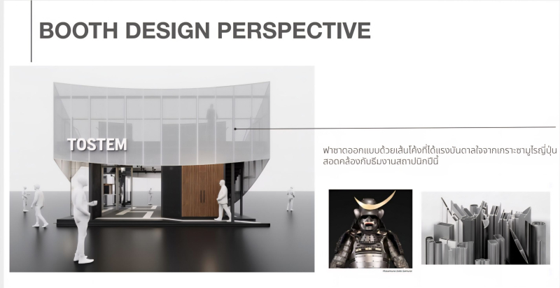 งานสถาปนิก’69 ครั้งนี้ TOSTEM ได้เปิดมิติให้ผู้เข้าชมได้สัมผัสสุนทรียภาพของการจัดสรรสเปซ ผ่านมุมมองของ ภากร มหพันธ์ สถาปนิกจากบริษัท เอ็มสเปซ จำกัด (M SPACE) ที่เริ่มต้นเล่าเรื่องราวตั้งแต่ปราการด่านแรกอย่างฟาซาด โดยหยิบยกความอ่อนช้อยทว่าแข็งแกร่งของเกราะซามูไรญี่ปุ่นมาตีความใหม่เป็นเส้นสายโค้งมนที่ดูมีชีวิต ตัวโครงสร้างถูกออกแบบให้ลอยเด่นและเปิดกว้างทั้ง 4 ทิศทาง เชิญชวนให้ทุกคนก้าวเข้าสู่โลกของ TOSTEM พร้อมยกระดับประสบการณ์ด้วยชั้นลอย มองเห็นภาพรวมของพื้นที่จัดแสดงทั้งหมดได้จากด้านบน และโดดเด่นสะดุดตาจากระยะไกล ภายในบูธถูกเนรมิตเป็นเขาวงกตที่ได้รับแรงบันดาลใจจากจังหวะการเคลื่อนที่แบบพินบอล มานำทางให้ผู้คนออกสำรวจเส้นทางและใช้เวลากับแต่ละห้องย่อยที่เชื่อมกันอย่างไร้รอยต่อด้วยบานประตูและบานเลื่อน เพื่อเป็นพื้นที่ที่รอให้ทุกคนมาพิสูจน์แนวคิด “BEYOND THE FRAME” ด้วยตัวเอง