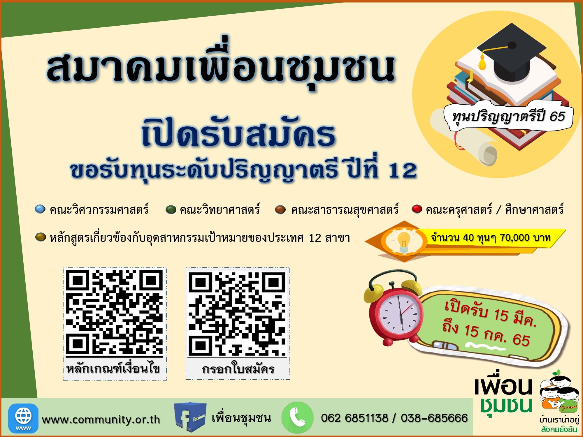 “สมาคมเพื่อนชุมชน” ขับเคลื่อนโครงการ “ทุนปริญญาตรีเพื่อนชุมชน” ปีที่ 12 เปิดโอกาสให้นักเรียนชั้นมัธยมศึกษาปีที่ 6 ในพื้นที่ จ.ระยอง เรียนดี แต่ขาดแคลนทุนทรัพย์ ชิงทุนการศึกษา จำนวน 40 ทุน มูลค่ากว่า 2 ล้านบาท เรียนต่อในระดับมหาวิทยาลัยสังกัดของรัฐบาล ป้อนบุคลากรเข้าสู่อุตสาหกรรมเป้าหมาย พื้นที่เขตพัฒนาพิเศษภาคตะวันออก เปิดรับสมัครแล้วตั้งแต่วันนี้ ถึงวันที่ 15 กรกฎาคม 2565