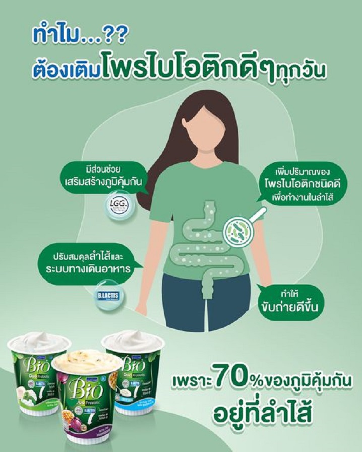 จากข้อมูลของ “ดัชมิลล์” ผู้นำสินค้านมเปรี้ยวและโยเกิร์ต ที่ได้นำเข้าและพัฒนาโพรไบโอติกหลายสายพันธุ์ เช่น LGGTM โพรไบโอติกลิขสิทธิ์เฉพาะสำหรับดัชมิลล์เท่านั้น ซึ่งผ่านการพิสูจน์ด้านประสิทธิภาพและมีการวิจัยรับรองมากที่สุดในโลกว่าสามารถช่วยสร้างเสริมภูมิคุ้มกัน และสายพันธุ์ B.Lactis ที่ได้รับการรับรองจากสถาบันวิจัยชั้นนำ มีส่วนช่วยปรับสมดุลลำไส้ ทำให้การขับถ่ายดีขึ้น ระบุว่า โพรไบโอติกมีส่วนช่วยดูแลระบบภูมิคุ้มกัน ช่วยลดการติดเชื้อในระบบทางเดินอาหารและลำไส้ ทั้งยังช่วยในเรื่องของระบบขับถ่าย ซึ่งคุณสมบัติเหล่านี้พบได้ในโยเกิร์ตดัชชี่ ไบโอทุกถ้วยซึ่งมีจุลินทรีย์มากกว่า 20,000 ล้านตัว ซึ่งเป็นจำนวนที่เพียงพอต่อการเติมประโยชน์ให้กับสุขภาพร่างกาย