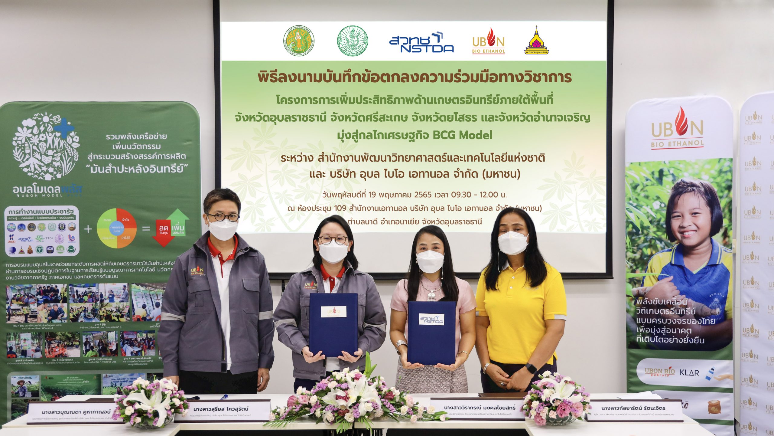 นางสาวสุรียส โควสุรัตน์ กรรมการผู้จัดการใหญ่ บริษัท อุบล ไบโอ เอทานอล จำกัด (มหาชน) (UBE) (ซ้าย) และ นางสาววิราภรณ์ มงคลไชยสิทธิ์ รองผู้อำนวยการ สำนักงานพัฒนาวิทยาศาสตร์และเทคโนโลยีแห่งชาติ (สวทช.) (ขวา) ลงนามในบันทึกข้อตกลงความร่วมมือทางวิชาการ เพื่อร่วมกันเดินหน้า “โครงการเพิ่มประสิทธิภาพด้านเกษตรอินทรีย์ภายใต้พื้นที่จังหวัดอุบลราชธานี จังหวัดยโสธร จังหวัดศรีสะเกษ และจังหวัดอำนาจเจริญ มุ่งสู่กลไลเศรษฐกิจ BCG Model” งานดังกล่าวจัดขึ้นเมื่อวันที่ 19 พฤษภาคม 2565 ที่ผ่านมา ณ บริษัท อุบล ไบโอ เอทานอล จำกัด (มหาชน) จ.อุบลราชธานี โดยมีผู้แทนจากหน่วยงานต่างๆ อาทิ สำนักงานเกษตรและสหกรณ์จังหวัดอุบลราชธานี สำนักงานเกษตรจังหวัดอุบลราชธานี สำนักงานเกษตรจังหวัดยโสธร สำนักงานเกษตรจังหวัดศรีสะเกษ สำนักงานเกษตรจังหวัดอำนาจเจริญ และเกษตรกรต้นแบบมันสำปะหลังอินทรีย์ ร่วมเป็นสักขีพยาน