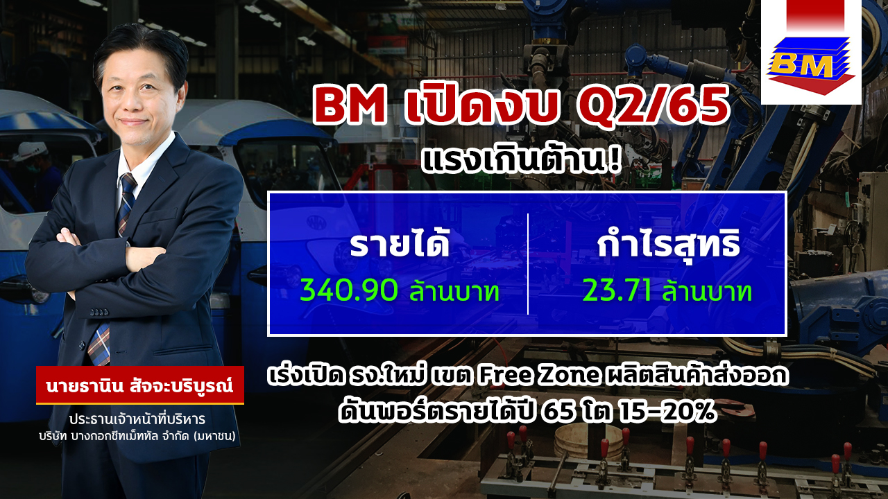 BM โชว์ผลงาน Q2 ปี 65 ทำรายได้กว่า 340 ล้านบาท โต 20% เล็งเปิดตัวโรงงานเขตฟรีโซน-รุกการส่งออกต่างประเทศ ดันพอร์ตรายได้ปี 65 โตตามเป้า 15-20% หนุนผลการดำเนินงานแกร่งระยะยาว