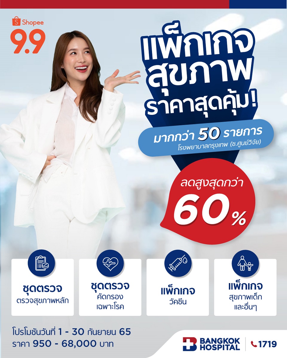 โรงพยาบาลกรุงเทพ สำนักงานใหญ่ (ซ.ศูนย์วิจัย) ร่วมมือกับ ช้อปปี้ ผู้นำอีคอมเมิร์ซอันดับ 1 ในเมืองไทย จัดเต็มในมหกรรม Shopee 9.9 วันช้อปแห่งปี : Super Shopping Day ด้วยชุดตรวจสุขภาพกับโปรโมชันสุขภาพราคาสุดคุ้ม ลดสูงสุดกว่า 60% ประกอบไปด้วย โปรแกรมตรวจสุขภาพหลักในแต่ละช่วงวัย ที่มาพร้อมกับการตรวจวัดพื้นฐาน ตรวจสุขภาพตา ตรวจคัดกรองการได้ยิน ตรวจความสมบูรณ์ของเม็ดเลือด การทำงานของตับและไต ฮอร์โมนไทรอยด์ สารบ่งชี้มะเร็ง การตรวจทางรังสี ตรวจหัวใจและหลอดเลือด ฯลฯ รวมไปถึงชุดตรวจคัดกรองเฉพาะโรค อาทิ ชุดตรวจหัวใจ ชุดตรวจสุขภาพสมอง ชุดตรวจสุขภาพสตรี ชุดตรวจคัดกรองมะเร็ง รายการตรวจสุขภาพฟัน รายการเสริมความงาม แพ็กเกจวัคซีน แพ็กเกจสุขภาพเด็ก และอื่นๆ อีกมากมาย ราคาเริ่มต้นที่ 950 -68,000 บาท ผู้ที่สนใจ สามารถซื้อชุดตรวจสุขภาพได้ตั้งแต่วันที่ 1 – 30 กันยายน 2565 โดยสามารถสั่งซื้อคูปอง E – Coupon ผ่านแอปฯ Shopee โดยค้นหาจากหน้าร้านออฟฟิเชียลสโตร์ Bangkok Hospital_official บน Shopee Mall หรือคลิก พิเศษ! สามารถเก็บโค้ดส่วนลดเพิ่มเติมจากหน้าร้านลดสูงสุด 999 บาท (มีจำนวนจำกัด) จำกัด 1 สิทธิ์ / ท่าน / โค้ด และ ใช้ได้กับ Application Shopee เท่านั้น
