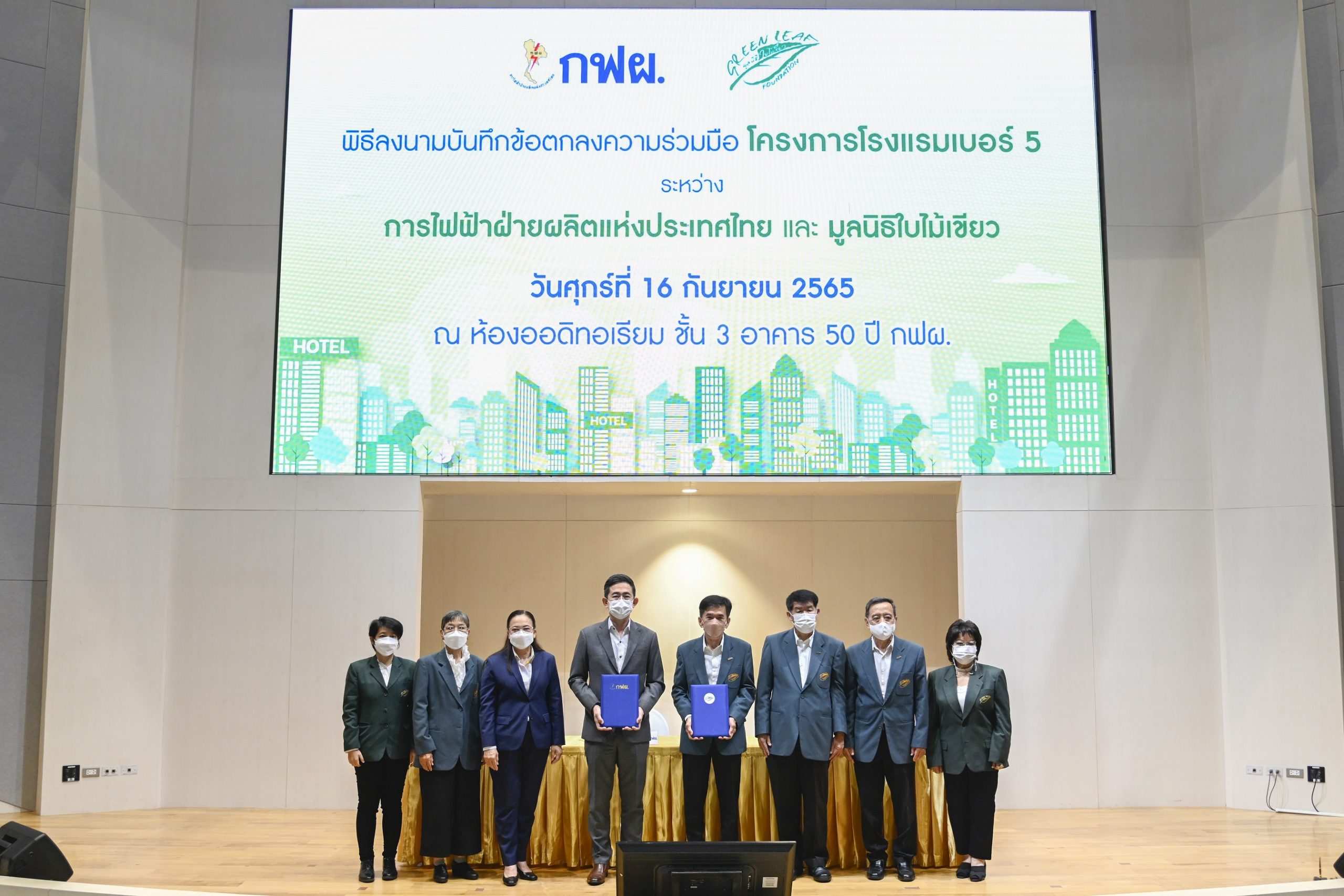 ดร.ธนวันต์ สินธุนาวา รองประธานและเลขาธิการมูลนิธิใบไม้เขียว ร่วมกับ นายบุญญนิตย์ วงศ์รักมิตร ผู้ว่าการการไฟฟ้าฝ่ายผลิตแห่งประเทศไทย (กฟผ.) เป็นผู้แทน กฟผ. ลงนามบันทึกข้อตกลงความร่วมมือโครงการโรงแรมเบอร์ 5 เพื่อพัฒนาประสิทธิภาพการใช้พลังงาน และพัฒนาคุณภาพสิ่งแวดล้อมของสถานประกอบการโรงแรม นำไปสู่การสร้างมาตรฐานการบริหารจัดการพลังงานที่ยั่งยืน โดยมีผู้บริหารจากทั้งสองหน่วยงานร่วมเป็นสักขีพยาน ณ ห้องออดิทอเรียม อาคาร 50 ปี กฟผ. สำนักงานใหญ่ กฟผ. จ.นนทบุรี เมื่อวันที่ 16 กันยายน 2565 ที่ผ่านมา