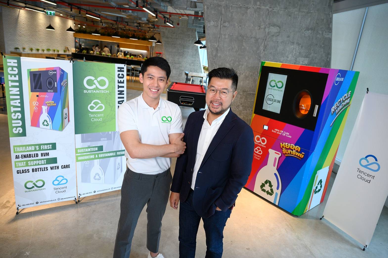 ด้าน มร. ชาง ฟู ประธานเจ้าหน้าที่ฝ่ายปฏิบัติการ บริษัท เทนเซ็นต์ (ประเทศไทย) จํากัด กล่าวว่า เทนเซ็นต์ คลาวด์รู้สึกยินดีเป็นอย่างยิ่งที่ได้เป็นส่วนหนึ่งในการช่วยยกระดับการบริหารจัดการขยะเพื่อนำกลับเข้าสู่ระบบด้วยการรีไซเคิล ผ่านการนำเสนอโซลูชันด้านเทคโนโลยีคลาวด์ และเอไอให้กับ SUSTAINTECH ได้แก่ เทคโนโลยี Image detection และเลเซอร์ ที่ทำงานสอดประสานกันในการช่วยคัดกรองขวดบรรจุภัณฑ์ พร้อมทั้งเสริมระบบการดำเนินงานของเครื่อง CircularOne ให้มีประสิทธิภาพ และความแม่นยำมากยิ่งขึ้น ซึ่งโซลูชันดังกล่าวไม่เพียงแต่แยกประเภทบรรจุภัณฑ์ที่ใช้แล้ว แต่ยังช่วยตรวจจับความผิดปกติของบรรจุภัณฑ์ประเภทขวดแก้ว ซึ่งถือเป็นประเภทบรรจุภัณฑ์ที่มีโอกาสนำกลับมาเข้าสู่ระบบการผลิตใหม่ได้ เช่น ในกรณีที่มีขวดมีรอยแตก หรืออยู่ในสภาพที่ไม่สมบูรณ์ ระบบจะทำการแจ้งเตือน และตีกลับทันที ซึ่งเทคโนโลยีนี้จะช่วยลดขั้นตอน และเพิ่มประสิทธิภาพให้กับการคัดแยกขวดบรรจุภัณฑ์ประเภทต่างๆ ได้ดียิ่งขึ้น