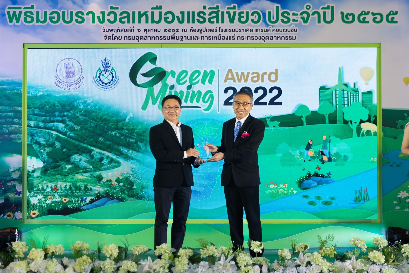 รับมอบรางวัล โครงการเหมืองแร่หินปูนเพื่ออุตสาหกรรมเคมี และโครงการเหมืองแร่ลิกไนต์แม่เมาะ จากนายภานุวัฒน์ ตริยางกูรศรี รองปลัดกระทรวงอุตสาหกรรม ในพิธีมอบรางวัลเหมืองแร่สีเขียว ประจำปี 2565 (Green Mining Award 2022) เมื่อวันที่ 6 ตุลาคม ที่ผ่านมา ซึ่งจัดโดยกรมอุตสาหกรรมพื้นฐานและ การเหมืองแร่ (กพร.) ณ โรงแรมมิราเคิล แกรนด์ กรุงเทพมหานคร