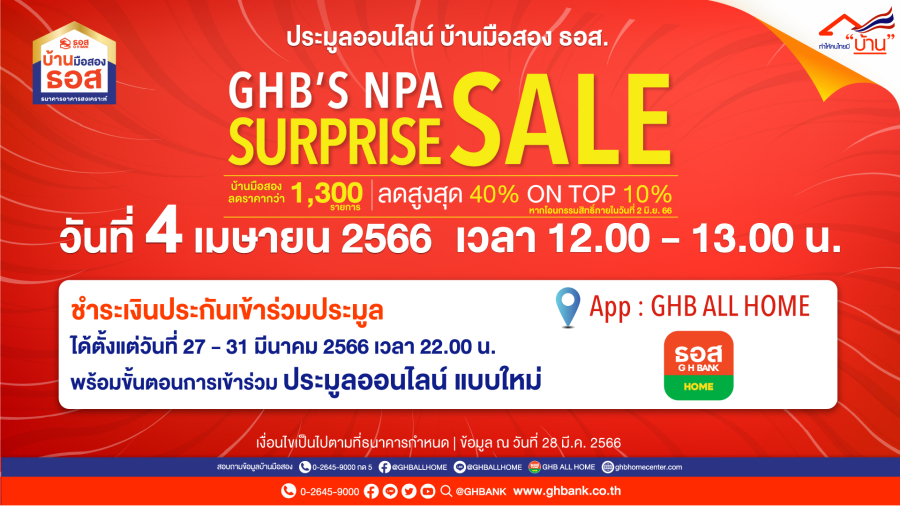 ธนาคารอาคารสงเคราะห์ จัดงานประมูลบ้านมือสองออนไลน์ “4.4 GHB’S NPA Surprise Sale” ผ่าน Application : GHB ALL HOME วันอังคารที่ 4 เมษายน 2566 นำทรัพย์เด่น ทำเลดีมากกว่า 1,300 รายการทั่วประเทศ มาจำหน่ายในราคาพิเศษลดสูงสุด 40% จากราคาประเมินปัจจุบัน พิเศษ!! พร้อมรับส่วนลด On Top เพิ่มอีก 10% จากราคาที่ปิดประมูลเมื่อทำนิติกรรมและโอนกรรมสิทธิ์ภายใน 2 มิถุนายน 2566 มั่นใจมีลูกค้าประชาชนยังคง ให้ความสนใจบ้านมือสอง ธอส. อย่างต่อเนื่อง หลังปี 2565 สามารถจำหน่ายผ่านช่องทางออนไลน์ได้ถึง 809.63 ล้านบาท