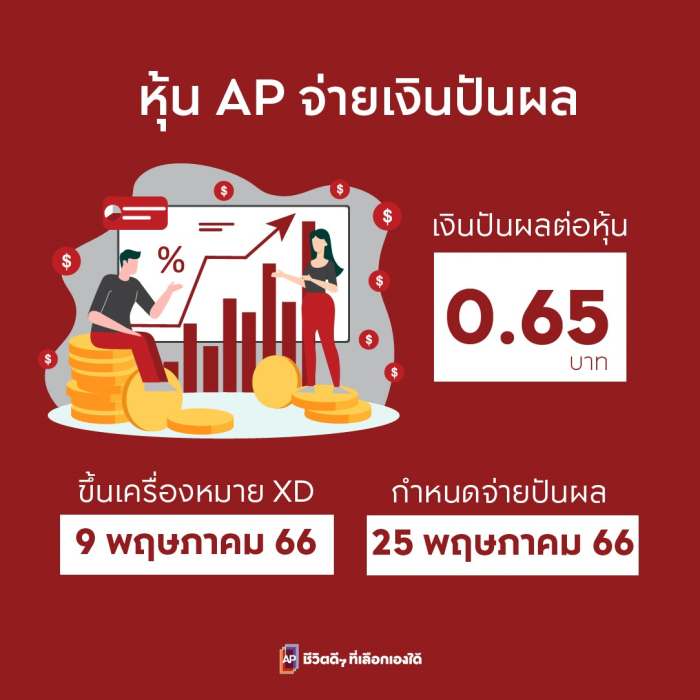 กรุงเทพฯ – บริษัท เอพี ไทยแลนด์ จำกัด (มหาชน) ผู้นำธุรกิจพัฒนาอสังหาริมทรัพย์ไทย เผยมติคณะกรรมการบริษัทฯ เมื่อวันที่ 27 เมษายน 2566 อนุมัติให้จ่ายเงินปันผลประจำปี 2565 จากผลการดำเนินงานในปี 2565 ตามงบการเงินสิ้นสุดวันที่ 31 ธันวาคม 2565 ที่ได้รับการตรวจสอบโดยผู้สอบบัญชีของบริษัทแล้ว ให้แก่ผู้ถือหุ้นสามัญในอัตราหุ้นละ 0.65 บาท เทียบกับปีก่อนที่มีการจ่ายปันผลในอัตราหุ้นละ 0.50 บาท โดยกำหนดวันที่ไม่ได้รับสิทธิปันผล (XD) วันที่ 9 พฤษภาคม 2566 และกำหนดจ่ายปันผลดังกล่าวในวันที่ 25 พฤษภาคม 2566