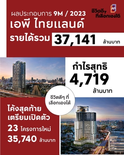 กรุงเทพฯ นายวิทการ จันทวิมล รองกรรมการผู้อำนวยการ สายงานกลยุทธ์องค์กรและ การสร้างสรรค์ บริษัท เอพี ไทยแลนด์ จำกัด (มหาชน) ผู้นำธุรกิจพัฒนาอสังหาริมทรัพย์ไทย ภายใต้คำมั่นสัญญา “ชีวิตดีๆ ที่เลือกเองได้” กล่าวว่า ผลการดำเนินงาน 9 เดือนแรกของปี 2566 บริษัทฯ มีอัตราการเติบโตเป็นที่น่าพอใจ โดยมีรายได้รวมจากสินค้ากลุ่มแนวราบ กลุ่มคอนโดมิเนียม (100% JV) และธุรกิจอื่นๆ ได้สูงถึง 37,141 ล้านบาท กำไรสุทธิเท่ากับ 4,719 ล้านบาท ทั้งนี้ ณ ไตรมาส 3 ที่ผ่านมาบริษัทฯ สามารถสร้างรายได้รวมจากสินค้ากลุ่มแนวราบ กลุ่มคอนโดมิเนียม (100% JV) และธุรกิจอื่นๆ ได้สูงถึง 13,285 ล้านบาท เพิ่มขึ้นจากปีที่แล้วที่มีรายได้รวมเท่ากับ 12,290 ล้านบาท