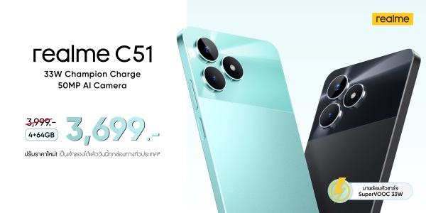กรุงเทพฯ – realme (เรียลมี) แบรนด์สมาร์ตโฟนเพื่อคนรุ่นใหม่ที่เติบโตเร็วที่สุดในโลก เอาใจสายบัดเจ็ตโฟน ปรับราคา “realme C51” เหลือเพียง 3,699 บาท จากปกติ 3,999 บาท ให้คุณเป็นเจ้าของสมาร์ตโฟนระดับแชมป์เปี้ยนอย่างคุ้มค่ายิ่งขึ้น เหมาะกับผู้ที่กำลังมองหามือถือราคาประหยัดสำหรับใช้งานทั่วไป แต่ยังคงได้ประสิทธิภาพใกล้เคียงกับรุ่นเรือธงด้วยกลยุทธ์การอัปเกรด 4 ฟีเจอร์หลักภายใต้ปรัชญา “No leap, no launch” ไม่ว่าจะเป็นกล้องถ่ายภาพความละเอียดสูง ระบบชาร์จไว ดีไซน์สุดพรีเมียม และพื้นที่เก็บข้อมูลแบบจัดเต็ม พร้อมจำหน่ายแล้วตั้งแต่วันนี้ที่ realme Brand Shop ทุกสาขา ศูนย์จำหน่ายสมาร์ตโฟนชั้นนำทั่วประเทศและช่องทางอีคอมเมิร์ซทั้ง Shopee, Lazada และ Tiktok Shop