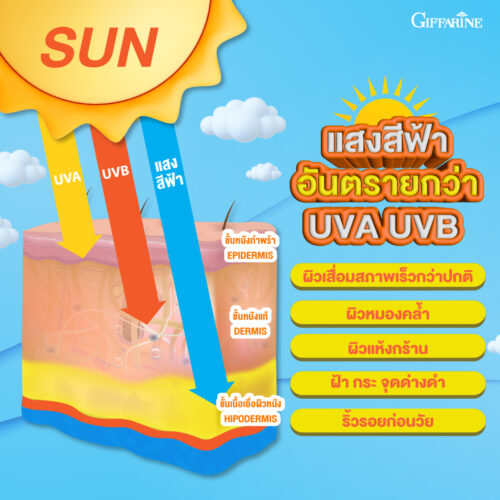 – รังสี UVB เป็นรังสีที่ทำร้ายผิวแค่ผิวหนังชั้นนอก แต่ก็ทำให้ผิวไหม้แดดและเป็นมะเร็งผิวหนังได้