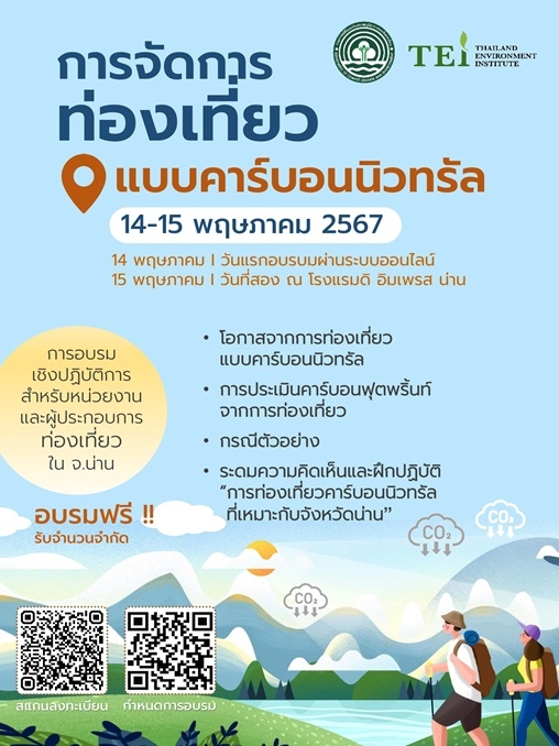 สถาบันสิ่งแวดล้อมไทย หรือ TEI ตอกย้ำการเป็นองค์กรชั้นนำด้านสิ่งแวดล้อม ที่น่าเชื่อถือและพึ่งพาได้ พร้อมขับเคลื่อนนโยบายการจัดการสิ่งแวดล้อมเชิงรุก สู่การปฏิบัติร่วมกับภาครัฐ เอกชน และประชาสังคม จับมือ กรมการเปลี่ยนแปลงสภาพภูมิอากาศและสิ่งแวดล้อม (DCCE) เตรียมเปิดการอบรมเชิงปฏิบัติการหลักสูตรการจัดการท่องเที่ยวแบบคาร์บอนนิวทรัล 14-15 พฤษภาคมนี้ ณ โรงแรมดิ อิมเพรส น่าน จังหวัดน่าน และระบบออนไลน์ Zoom ธุรกิจการท่องเที่ยวเป็นหนึ่งในเสาหลักด้านเศรษฐกิจของประเทศที่สามารถเพิ่มมูลค่า GDP และนำมาซึ่งรายได้เข้าประเทศจำนวนมาก พร้อมทั้งเป็นการสร้างงานสร้างรายได้ให้กับชุมชนท้องถิ่นทั่วทุกภูมิภาคของประเทศ รวมทั้งจังหวัดน่าน จัดว่าเป็นจังหวัดที่มีศักยภาพด้านการท่องเที่ยวสูงและสมบูรณ์ที่สุดแห่งหนึ่งของประเทศ โดยมีทรัพยากรเพื่อการท่องเที่ยวหลากหลาย ศูนย์วิจัยการเปลี่ยนแปลงสภาพภูมิอากาศและสิ่งแวดล้อม กรมการเปลี่ยนแปลงสภาพภูมิอากาศและสิ่งแวดล้อม กระทรวงทรัพยากรธรรมชาติและสิ่งแวดล้อม เห็นความสำคัญและเลือกให้จังหวัดน่าน เป็นพื้นที่เป้าหมายในการพัฒนาศักยภาพบุคลากร สำหรับกลุ่มผู้ประกอบการธุรกิจท่องเที่ยวและหน่วยงานที่เกี่ยวข้อง จัดการอบรมเชิงปฏิบัติการหลักสูตรการจัดการท่องเที่ยวแบบคาร์บอนนิวทรัล โดยผู้ประกอบการโรงแรมและที่พัก บริษัททัวร์ ร้านอาหาร ท่องเที่ยวชุมชน และผู้สนใจ