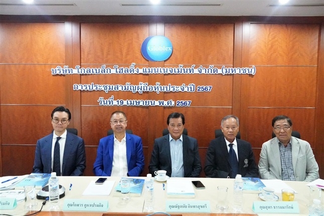 นายโอฬาร คูหาเปรมกิจ ประธานกรรมการ (ที่ 2 จากซ้าย) นายธราภุช คูหาเปรมกิจ กรรมการผู้จัดการ (ซ้าย) พร้อมด้วยคณะผู้บริหาร บริษัท โกลเบล็ก โฮลดิ้ง แมนเนจเม้นท์ จำกัด (มหาชน) หรือ GBX ร่วมประชุมสามัญผู้ถือหุ้นประจำปี 2567 ผ่านสื่ออิเล็กทรอนิกส์ (E-AGM) โดยที่ประชุมผู้ถือหุ้นมีมติอนุมัติจ่ายเงินปันผลจากกำไรสุทธิงวดผลการดำเนินงานปี 2566 ที่อัตราหุ้นละ 0.055 บาท คิดเป็นจำนวนเงิน 59.90 ล้านบาท โดยกำหนดจ่ายเงินปันผลให้แก่ผู้ถือหุ้นในวันที่ 10 พฤษภาคมนี้ ณ สำนักงานใหญ่ บมจ. โกลเบล็ก โฮลดิ้ง แมนเนจเม้นท์