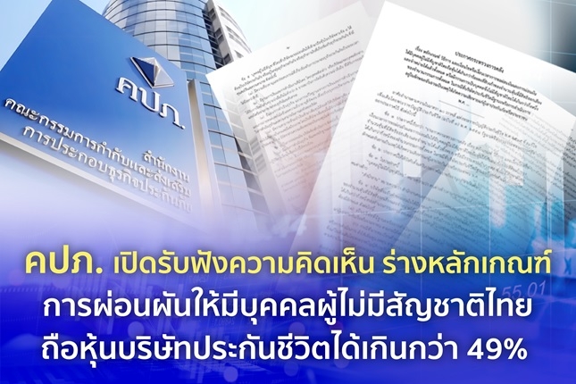 สำนักงานคณะกรรมการกำกับและส่งเสริมการประกอบธุรกิจประกันภัย (สำนักงาน คปภ.) ได้จัดทำร่างประกาศกระทรวงการคลัง เรื่อง หลักเกณฑ์ วิธีการ และเงื่อนไขหรือเงื่อนเวลาการขอผ่อนผันและการผ่อนผันให้มีบุคคลผู้ไม่มีสัญชาติไทยถือหุ้นได้เกินกว่าร้อยละสี่สิบเก้าของจำนวนหุ้นที่มีสิทธิออกเสียงและจําหน่ายได้แล้วทั้งหมด หรือมีกรรมการเป็นบุคคล