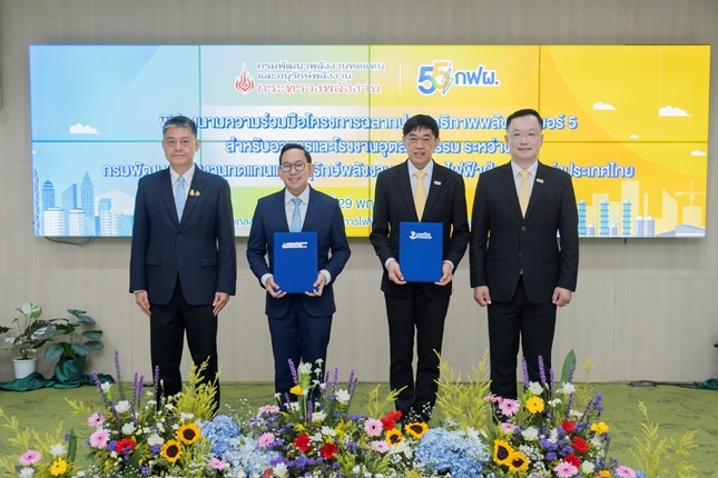 พพ. ร่วมกับ กฟผ. ลงนามบันทึกข้อตกลงความร่วมมือยกระดับประสิทธิภาพพลังงานของโรงงานและอาคาร ส่งเสริมผู้ประกอบการติดฉลากแสดงประสิทธิภาพพลังงานเบอร์ 5 รวมทั้งเตรียมความพร้อมการบังคับใช้กฎหมายและมาตรการประหยัดพลังงานของไทยและสากล