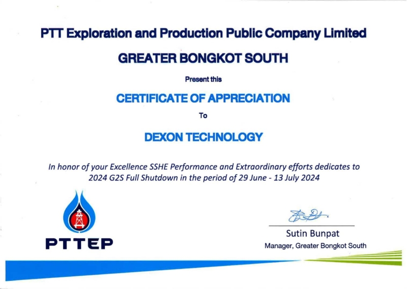 บริษัทเด็กซ์ซอน เทคโนโลยี จำกัด (มหาชน) รับมอบประกาศเกียรติคุณในฐานะองค์กรที่มีความโดดเด่นด้านการบริหารจัดการความมั่นคง ความปลอดภัย อาชีวอนามัย และสิ่งแวดล้อม (SSHE) จากบริษัท ปตท.สำรวจและผลิตปิโตรเลียม จำกัด (มหาชน) หรือ ปตท.สผ. ผู้ดำเนินการโครงการบงกชใต้ แหล่งก๊าซธรรมชาติที่ใหญ่ที่สุดในอ่าว รางวัลดังกล่าวสะท้อนความมุ่งมั่นของทั้งสององค์กรในการดำเนินงานตามมาตรฐานความปลอดภัยระดับสูงสุด โดยเฉพาะในพื้นที่ปฏิบัติการแหล่งบงกชใต้ (Greater Bongkot South: GBS) นอกชายฝั่งจังหวัดสงขลา