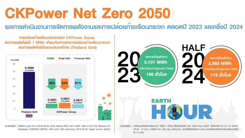 ในการเดินหน้าสู่เป้าหมายตามแผนงาน CKP NET ZERO EMISSIONS 2050 เพื่อมุ่งสู่การเป็นองค์กรที่สามารถปล่อยก๊าซเรือนกระจกสุทธิเป็นศูนย์ภายในปี 2593 โดยการดำเนินงานที่สำคัญที่ทำให้ ซีเค พาวเวอร์ บรรลุเป้าหมาย คือ การเพิ่มประสิทธิภาพกระบวนการผลิตไฟฟ้า บริษัทได้วางแผนระยะยาวโดยมุ่งเน้นขยายการลงทุนในโครงการที่ช่วยลดการปล่อยก๊าซเรือนกระจก เช่น การศึกษาการผลิตไฟฟ้าจากเชื้อเพลิงไฮโดรเจนผสมก๊าซธรรมชาติในโรงไฟฟ้าพลังความร้อนร่วม สอดรับกับการเปลี่ยนผ่านด้านพลังงานของไทยตามร่างแผนพัฒนากำลังผลิตไฟฟ้าของประเทศไทย พ.ศ. 2567 – 2580 (PDP2024) และ 6 เดือนแรกในปี 2567 บริษัทสามารถเพิ่มประสิทธิภาพการใช้พลังงานในการผลิตไฟฟ้าได้ดีกว่าเป้าหมาย 0.86% นอกจากการบริหารจัดการการปล่อยก๊าซเรือนกระจกและการพัฒนาปรับปรุงประสิทธิภาพการผลิตไฟฟ้าแล้ว บริษัทได้มีการปรับใช้ไฟฟ้าจากพลังงานหมุนเวียนภายในองค์กรเพิ่มขึ้น เช่น การเปลี่ยนมาใช้รถที่ใช้พลังงานไฟฟ้าและรถไฮบริดในการขนส่งภายในสำนักงานและโรงไฟฟ้าในเครือฯ